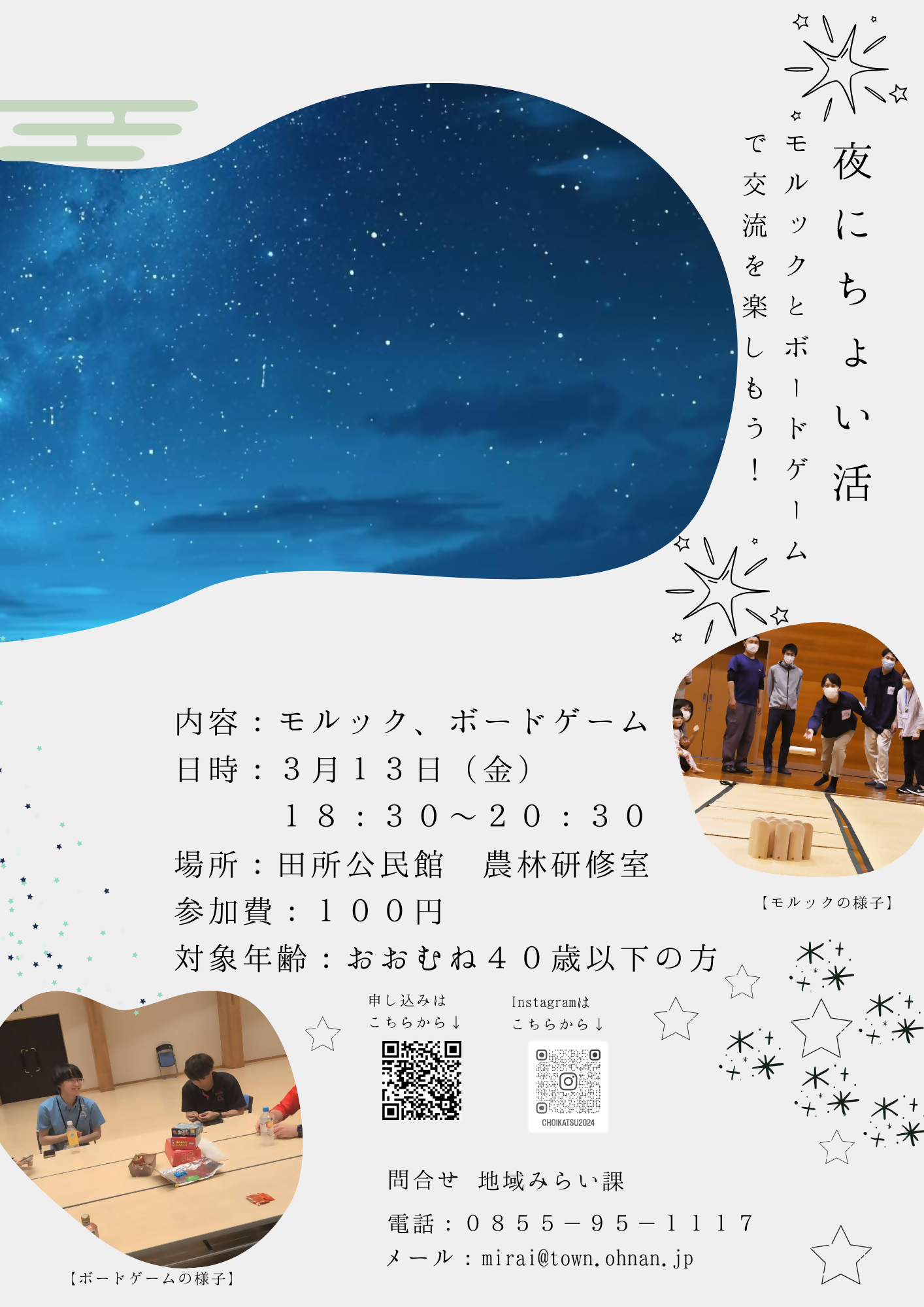 「夜にちょい活」とは、おおむね40歳以下の方を対象に、ボードゲームやモルックなどの活動を通して、同世代の人との交流を図ることを目的としている活動です。皆さんもちょいとした活動を楽しみながら交流を深めてみませんか?