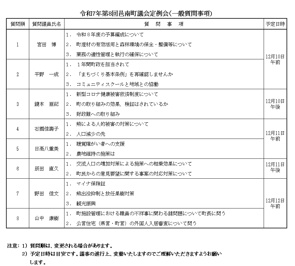 令和7年12月定例会一般質問は、12月10日(水)、11日(木)、12日(金)に行います。