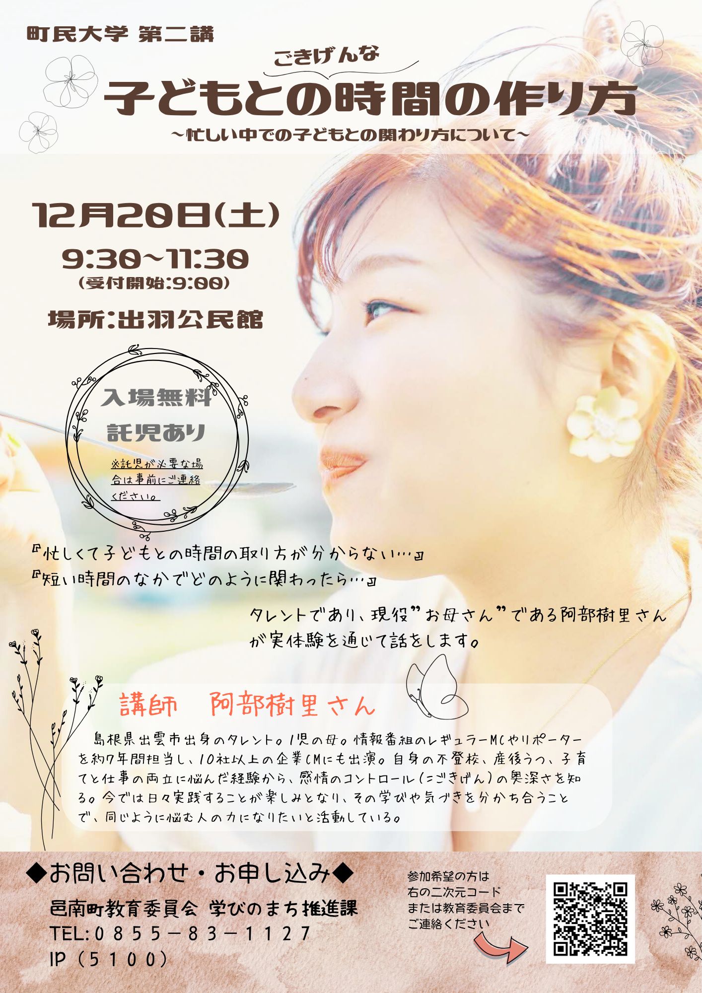 この度、タレントであり、不登校経験があり、現在、子育てを行っている阿部樹里さまをお迎えし、「子どもとのごきげんな時間」をテーマにご講演いただきます。